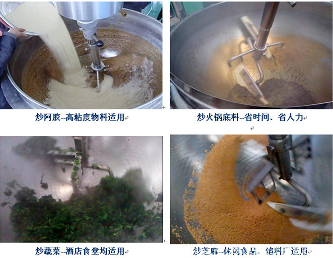 行星攪拌炒鍋攪拌系統(tǒng)采用自轉(zhuǎn)公轉(zhuǎn)相結(jié)合的方式,其傳動比為不整數(shù)傳動比,保證鍋內(nèi)無任何攪拌盲點(diǎn)。行星攪拌炒鍋可用于炒菜、煮粥、煮筍干、熬湯、燒水、煮飯、化糖、化膠、熬糖稀、熬油、炒餡料(蓮蓉餡、月餅餡、綠豆餡、豆沙餡等)、糕點(diǎn)、飲料、蜜餞、醬料(如:豆瓣醬,甜面醬,花生醬,辣椒醬,牛肉醬、火鍋底料、方便面醬料、香菇醬等)等食品行業(yè)以及制藥(藥材和焙烤)與日用化工等行業(yè)。不同物料,設(shè)計(jì)細(xì)節(jié)不同。