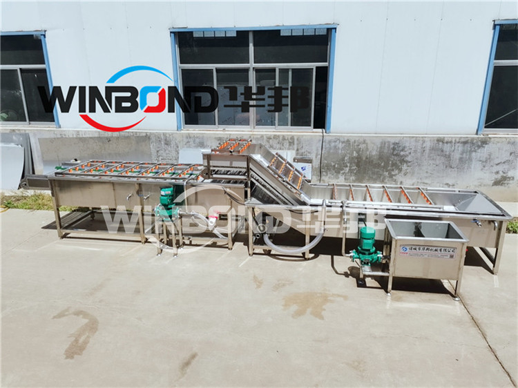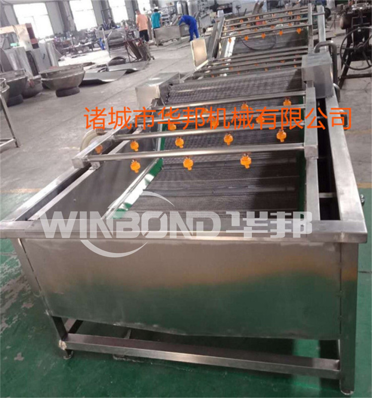 該設備配有鼓泡、沖浪、噴淋等裝置,可適用于蔬菜水果水產品等顆粒狀、葉類、根莖類產品的清洗。本機除電機、風機、循環(huán)泵以外,其他均采用SUS304不銹鋼材料,符合 食品行業(yè)使用標準。本機采用鼓泡、沖浪、提升處凈水噴淋。一側有去雜循環(huán)水箱,所有雜物經此水箱過濾去雜,其中網帶提升處為凈水噴淋。