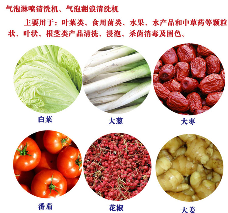 蔬菜,水果、水產品等顆粒狀、葉狀、根莖類產品清洗、浸泡、和對腌漬品脫鹽等。辣椒、小白菜、蘑菇、菠菜、青菜、包菜、生菜、韭菜、蒜苗、芹菜、龍須菜、苘蒿、山蟄菜、空心菜、木耳、銀耳、地耳、石耳、平菇、草菇、金針菇、茶樹菇、裙帶菜等